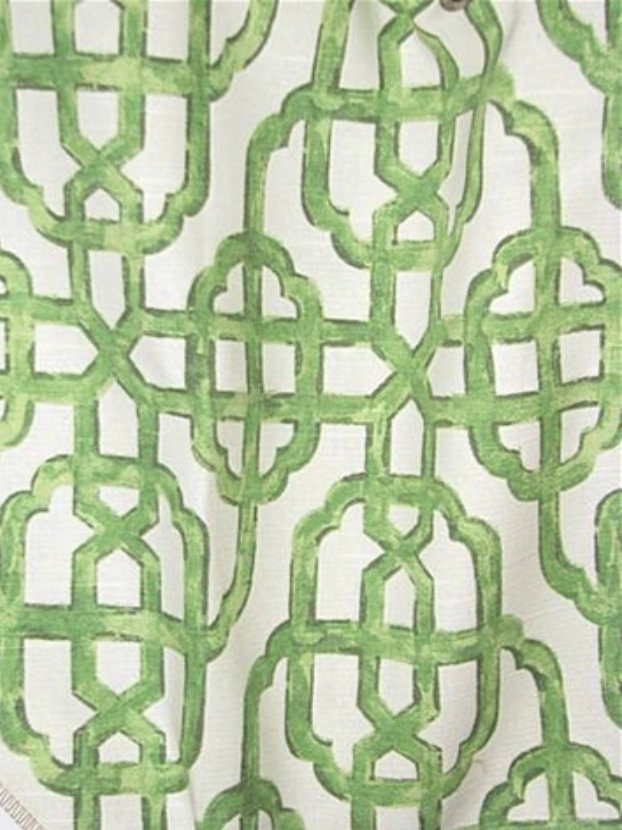 Roman shades in a blue trellis pattern, or jade green, coral or bisque.