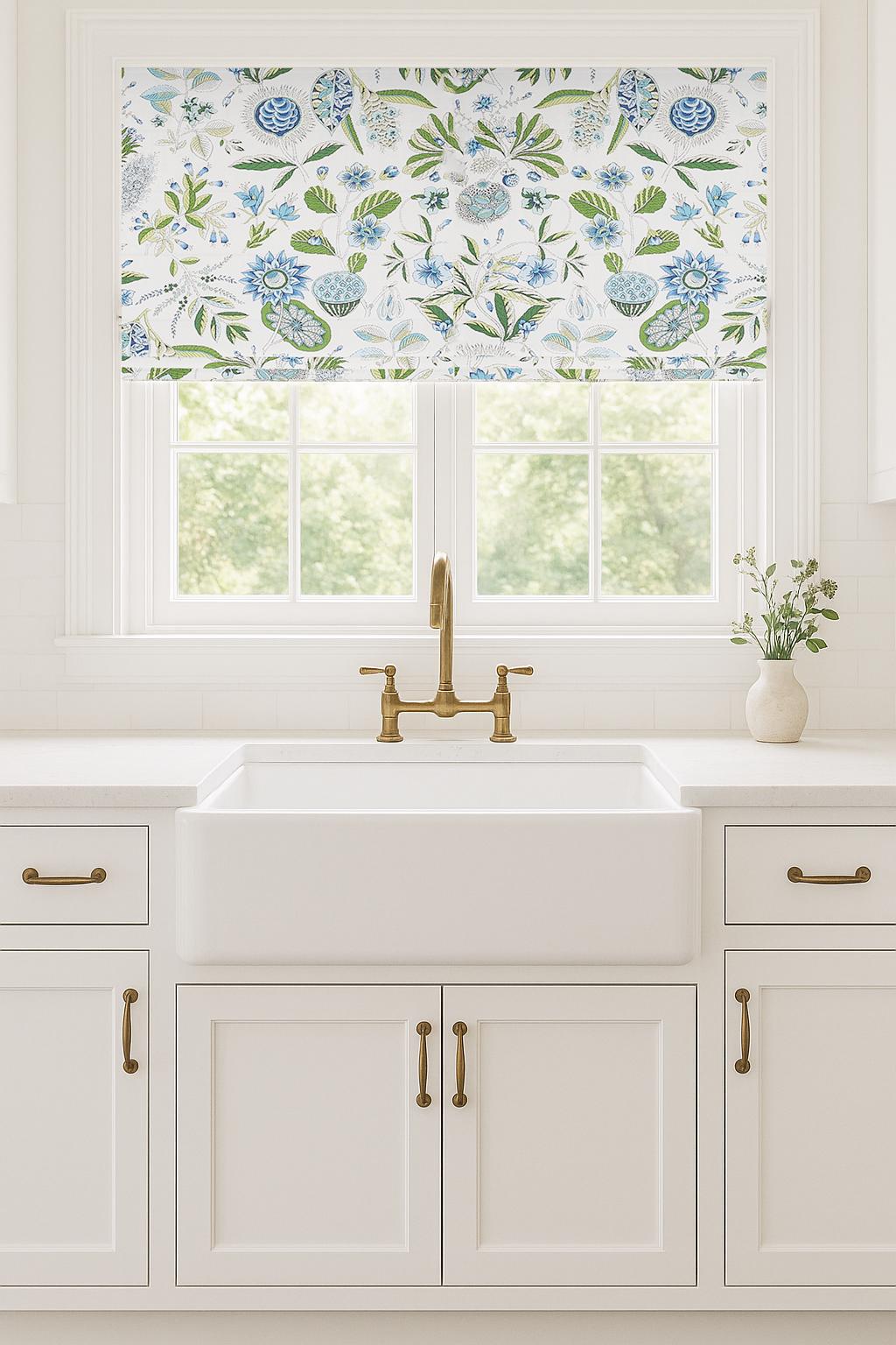 Schumacher Roman shade Roca Redondo roman shade green and white blue window shade bedroom roman blinds window floral roman shades blinds
